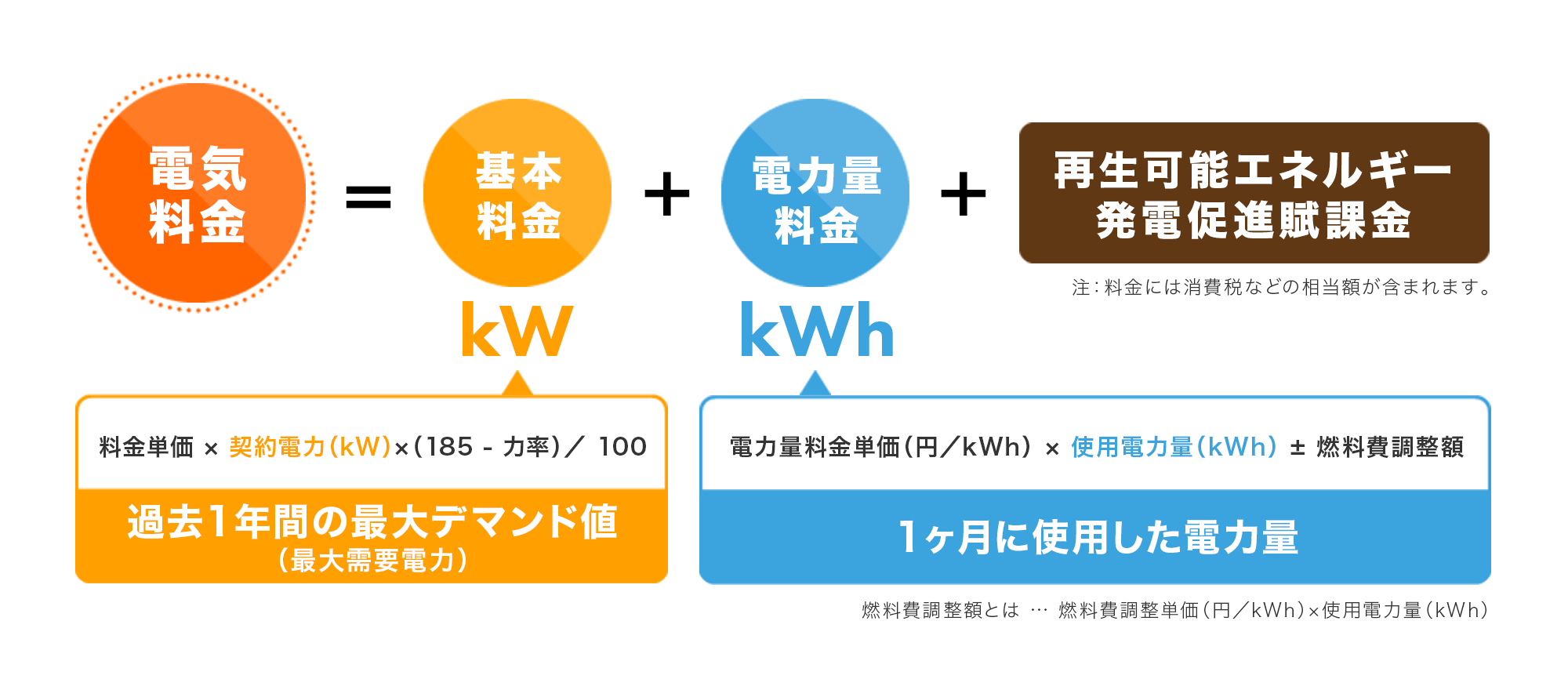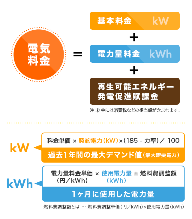 電気料金は、基本料金(kW)+電力量料金(kWh)+再生可能エネルギー発電促進賦課金の合計金額で算出されます。